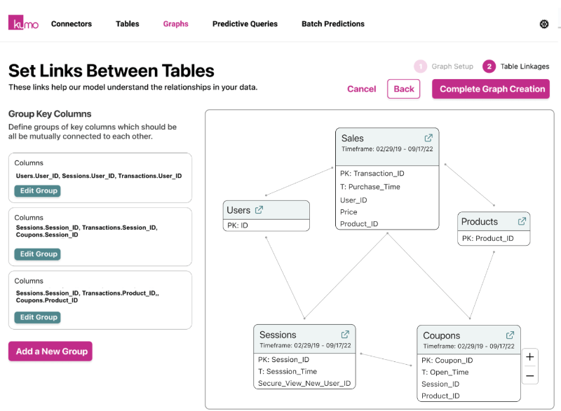 Kumo lets you quickly connect your data sources to build the graph in a matter of seconds. This graph is built in a way that’s optimized for GNN learning.