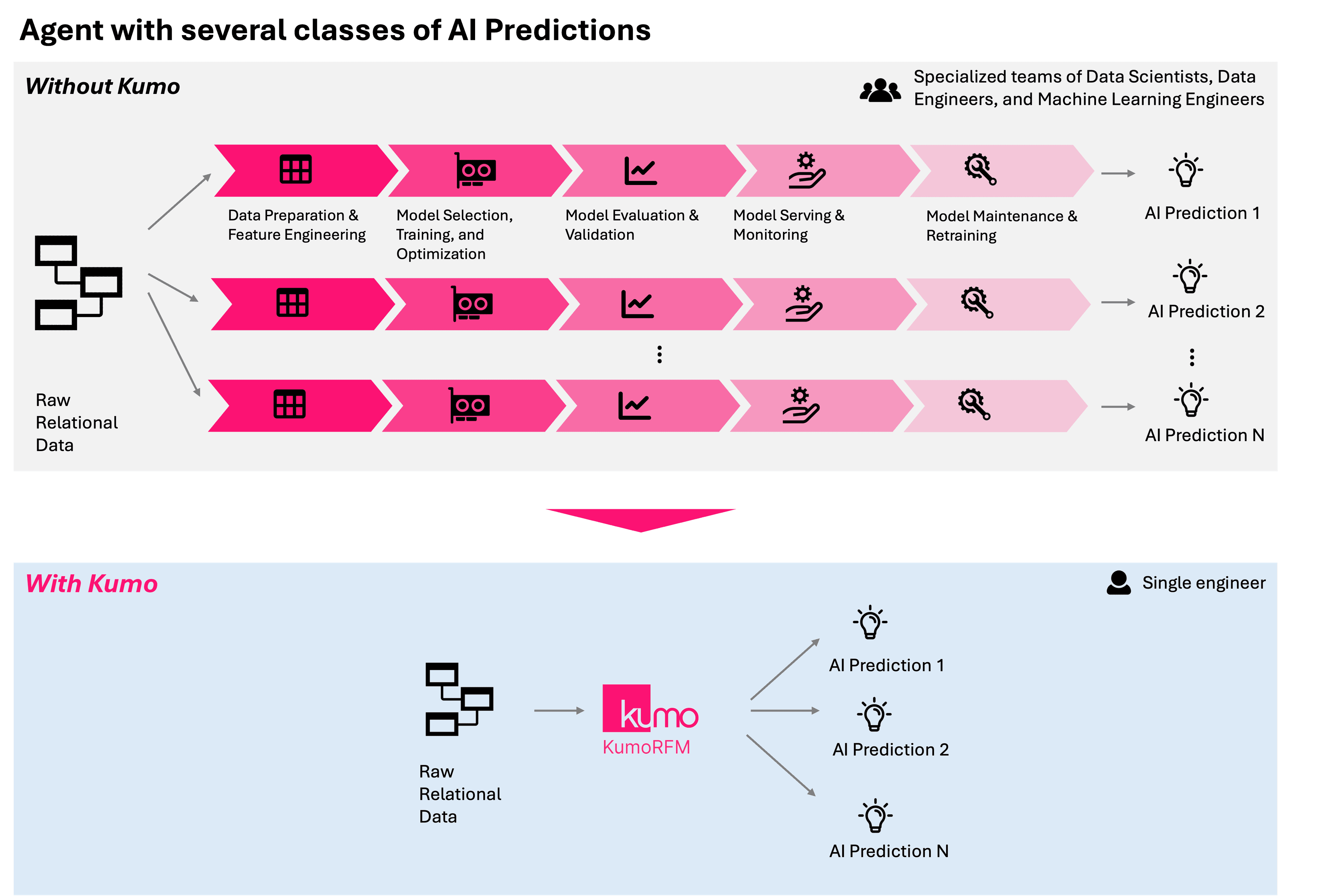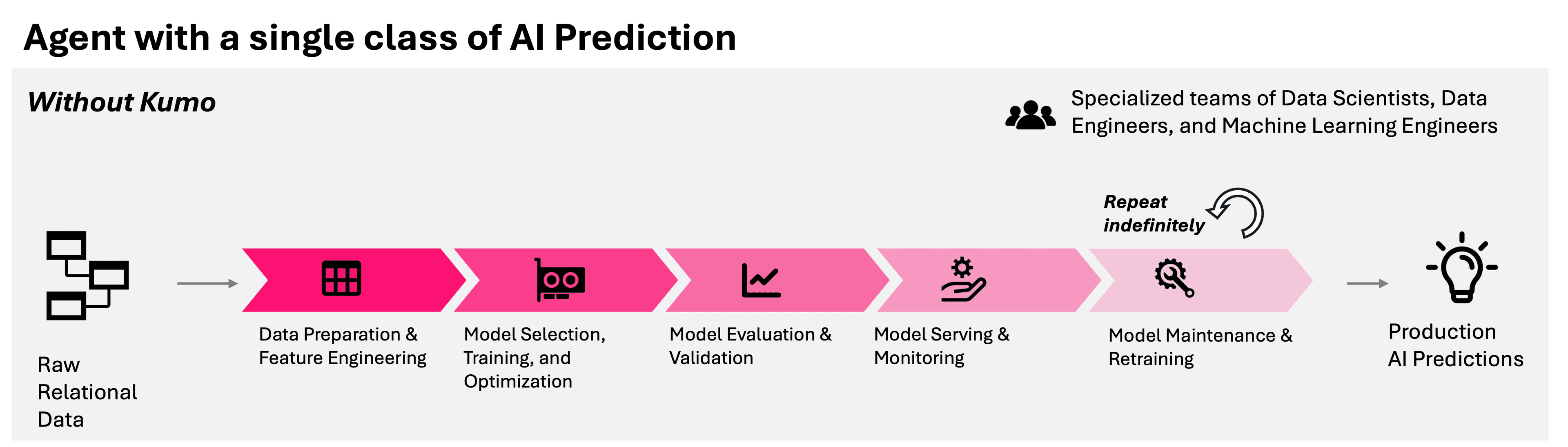 Building predictive AI into agents is not trivial. The traditional approach involves standing up custom machine learning models and pipelines, a process that can take months and requires teams of specialists to perform the following iterative tasks: