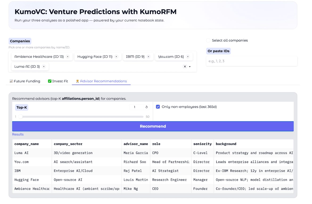 The advisor recommendation use case was equally interesting. While the profiles were synthetic, the relationships highlighted by KumoVC showed logical, realistic patterns. For instance, the system suggested a research engineer with expertise in open-source NLP and model distillation as an advisor for Hugging Face—exactly the kind of background that would add value to such a company. Similarly, IBM’s recommended advisor was an AI Strategy Director and former IBM employee, which aligned with what you’d expect in a real-world scenario.