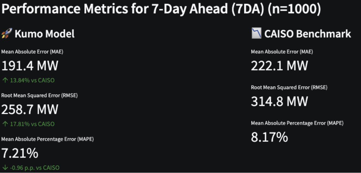 The effect of adding basic features was dramatic. Kumo RFM was able to leverage these simple, new signals to produce a forecast that was more accurate than the official CAISO benchmark.