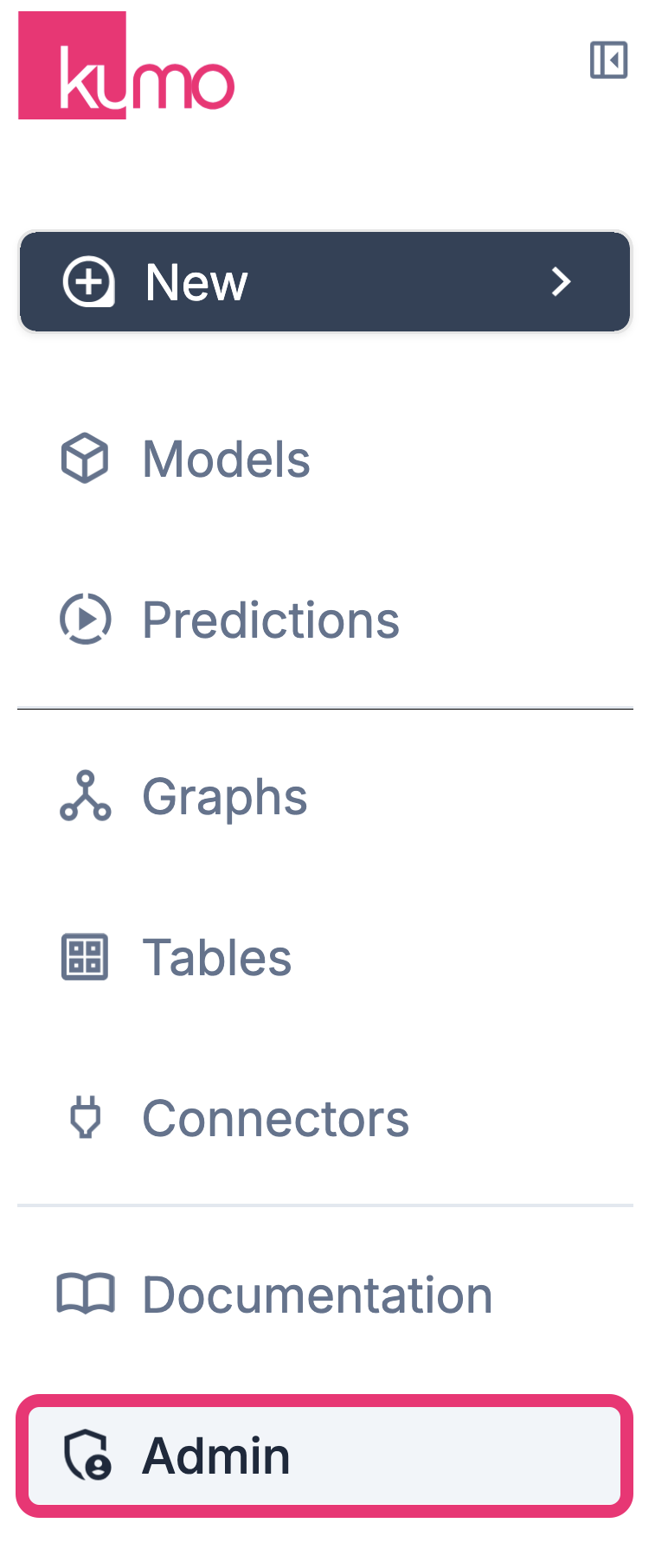 Kumo’s REST API requires an API key to authenticate requests. To generate one, click the Admin tab in the left sidebar.