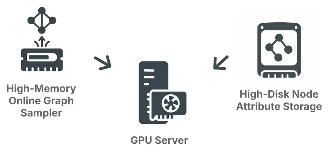 - Feature Store (SSD): The sampler returns node IDs. The feature store fetches their attributes from SSD storage. This allows you to work with terabytes of features without overloading GPU memory.