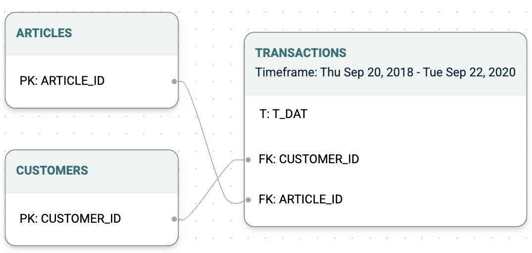 H&M Personalized Fashion Recommendations is a dataset for product (articles) recommendation for customers based on data from previous transactions provided publicly by H&M for data science experiments. The dataset contains three tables: customers, transactions and articles which were linked in a Kumo graph using primary (PK) and foreign key (FK) relationships.