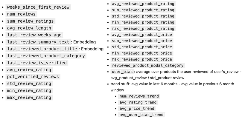 uses a text embedding of the last review, but discards any reviews prior to that. Lastly, features that try to capture trends, e.g., num_reviews_trend