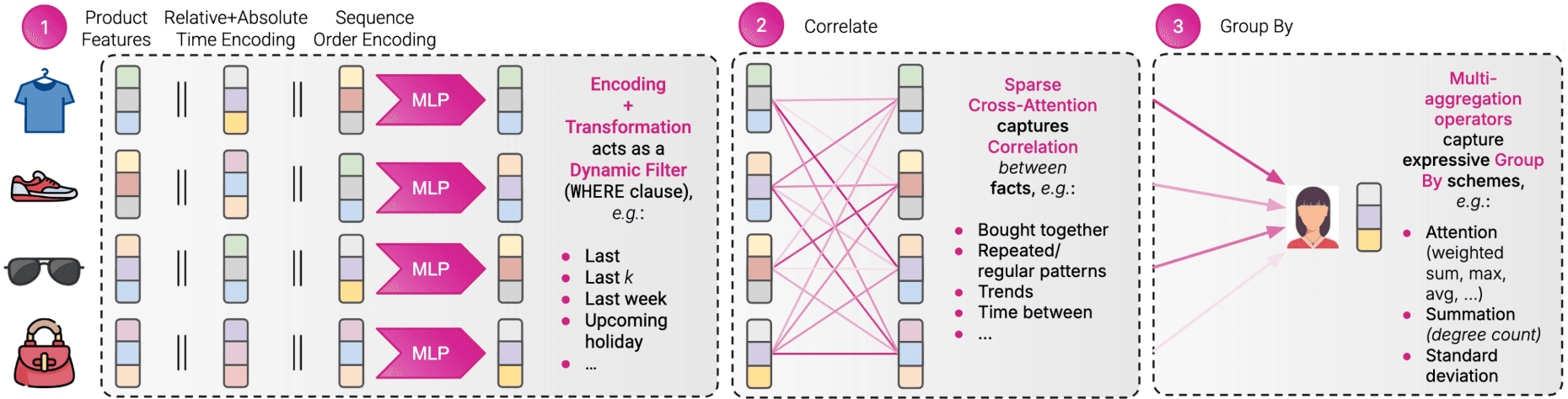 RDL provides a scalable, efficient, and versatile solution to the longstanding challenges of relational data. In particular, GNNs and their propagation schemes can be understood as learnable “Group By” operators that can dynamically (1) filter, (2) correlate, and (3) group interactions. By adapting to a given data distribution during training, they can find previously shown “hand-crafted features” on their own (and many more!), while not being bound by a data scientist’s imagination. This tree-stage approach have been proven to be highly effective. Firstly, the GNN can filter the set of interactions based on certain conditions such as product features, recency, seasonality, etc. Secondly, it computes sparse cross-attention on the filtered set to capture correlations such as “Bought together” patterns, repeated/regular patterns, trends, etc. Lastly, it performs multi-aggregation to merge fact representations into a single embedding tied to a specific user.