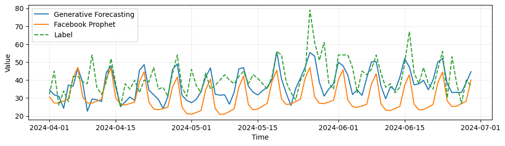 Comparison to Facebook Prophet. We compare our forecasting results against forecasts from Facebook Prophet. While Prophet also captures trend and seasonality mostly correct, it shows slightly more divergence and more mean collapse behavior.