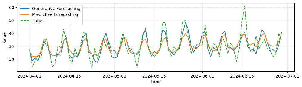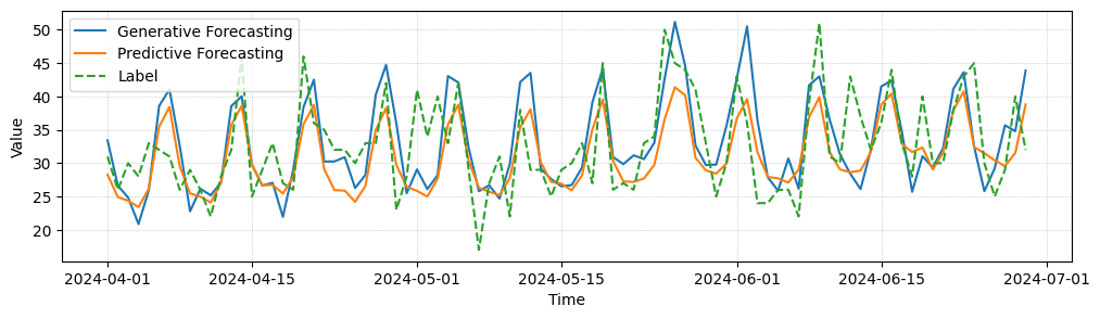 We compare predictive and generative forecasting results for three entities of a forecasting task, where our models make one prediction per day for the next 90 days in advance. While quantitatively both models perform similarly well, generative forecasting shows less mean collapse and captures some high frequency details better.